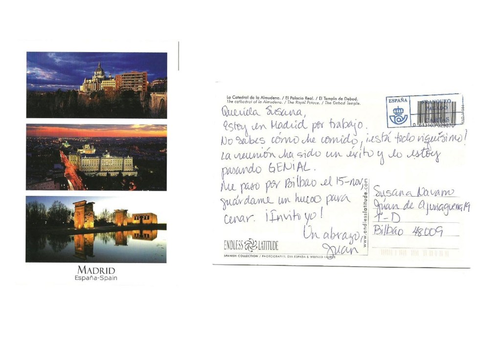 La tarjeta, con varias imágenes nocturnas de Madrid, nos hizo recapacitar. ¿Qué Juan?, ¿de dónde es y por qué está en Madrid trabajando y luego viene a Bilbao?, ¿por qué hasta dentro de tres semanas no nos llama?, Juan no es de Bilbao, etc. Incluso llegamos a palpar la escritura para comprobar que estaba escrito a mano y con bolígrafo.